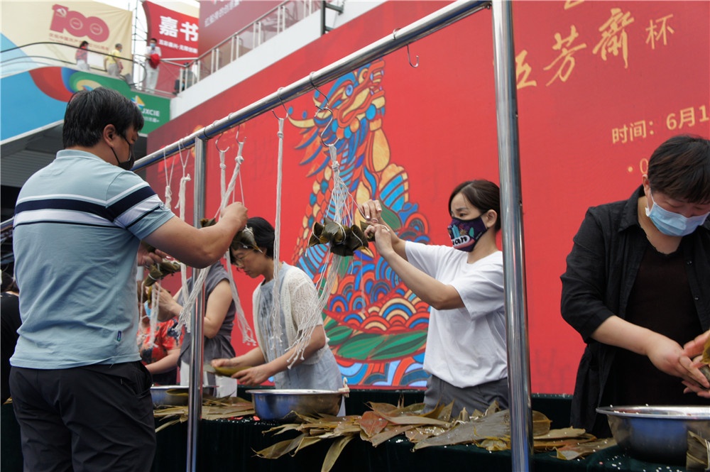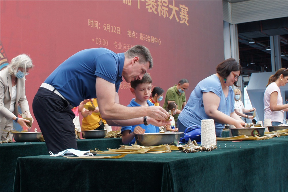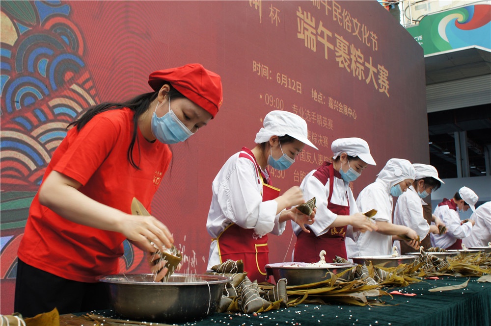 6月12日,嘉興國際會展中心內(nèi),共進行了專業(yè)組、市民組、海外組和臺胞組四組精彩紛呈的裹粽比賽。