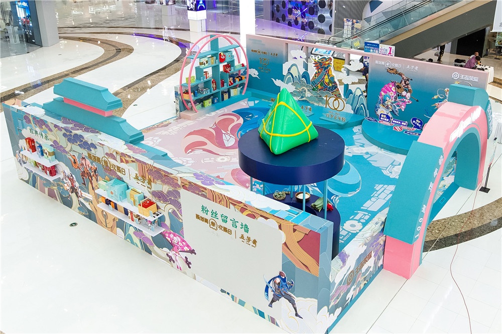 快閃店分為習粽區(qū)、游戲區(qū)、英雄區(qū)、禮盒區(qū),玩家在入口處就能獲得挑戰(zhàn)卡,按照游戲規(guī)則,分別需要學會投壺、丟沙包,練習眼力及手勁,再去習粽區(qū),跟從五芳齋專業(yè)粽藝師學習裹粽技藝,以及和5大英雄探討英雄之道獲得合影,最后去禮盒區(qū)挑選適合送給親友的好禮,充分體驗王者榮耀峽谷風情的端午節(jié)。
