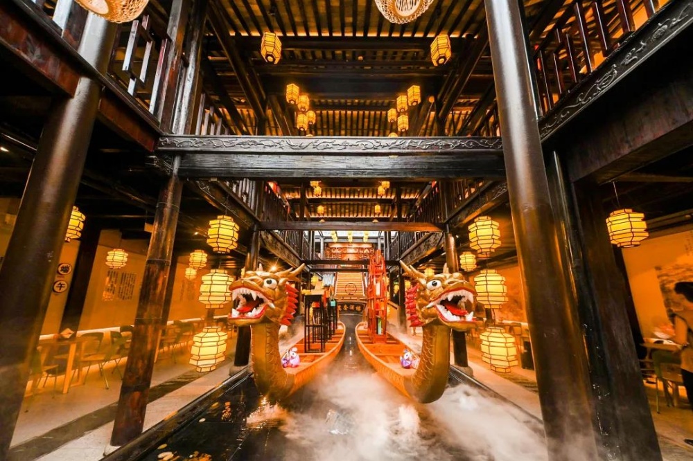 輕啟朱門,粉墻黛瓦,詩情畫意,一派風(fēng)情。抬望眼,霸氣的龍舟立于中庭,江南韻味十足的中式閣樓、小橋流水應(yīng)有盡有。傳統(tǒng)的木質(zhì)鉚接樓面,二十四節(jié)氣之景掩映其中,好一派溫柔的江南風(fēng)情。