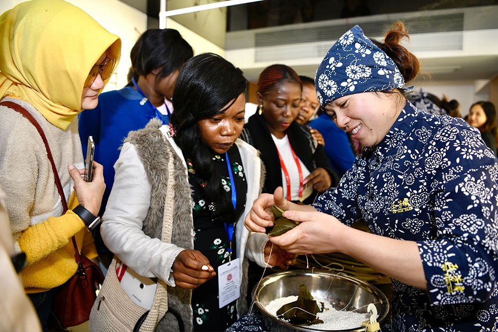 27位政黨婦女干部在中聯(lián)部國際交流中心劉亦淇、 中華女子學(xué)院國際合作處處長葉水平、省婦女干部學(xué)校副校長張武萍、嘉興市婦聯(lián)副主席陳敏紅的陪同下來到五芳齋產(chǎn)業(yè)園調(diào)研,五芳齋黨委副書記、工會主席王偉帶領(lǐng)參觀了粽藝長廊,感受五芳齋粽子獨(dú)特的制作工藝??吹焦展と藗兊捏@人速度外賓們贊嘆不已,紛紛拿起手機(jī)拍攝留念。來到粽藝長廊展示廳外賓們在裹粽師傅的指導(dǎo)下,擼起衣袖學(xué)習(xí)裹粽技藝足足體驗(yàn)了一把。五芳齋產(chǎn)業(yè)園作為此行的參觀點(diǎn),讓外賓們近距離了解五芳齋粽子的生產(chǎn)過程,同時(shí)也讓她們領(lǐng)略到中國傳統(tǒng)文化的濃濃氛圍,為交流活動增添了色彩。