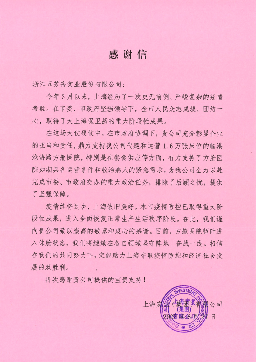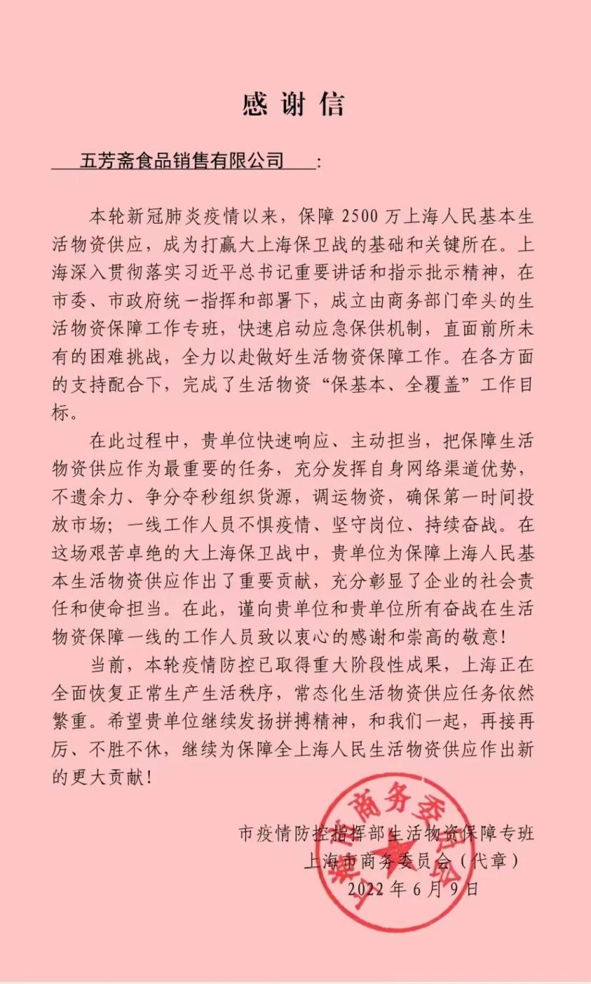 6月初,五芳齋收到了來自上海商務(wù)委員會、上海實(shí)業(yè)(集團(tuán))有限公司的感謝信,信中充分認(rèn)可了五芳齋在本輪上海新冠疫情抗疫保供工作中的積極作用,肯定了五芳齋的企業(yè)社會責(zé)任和使命擔(dān)當(dāng)。